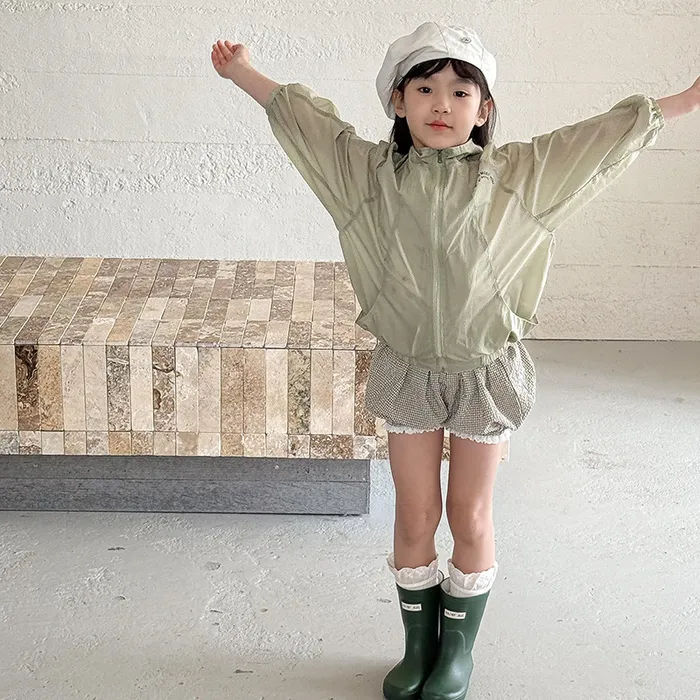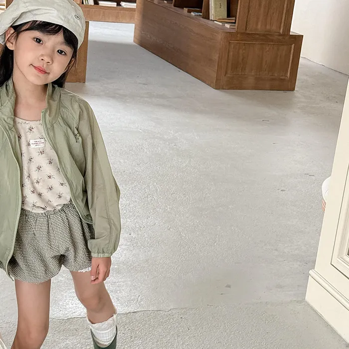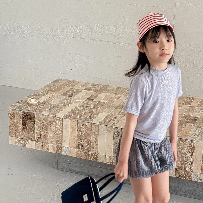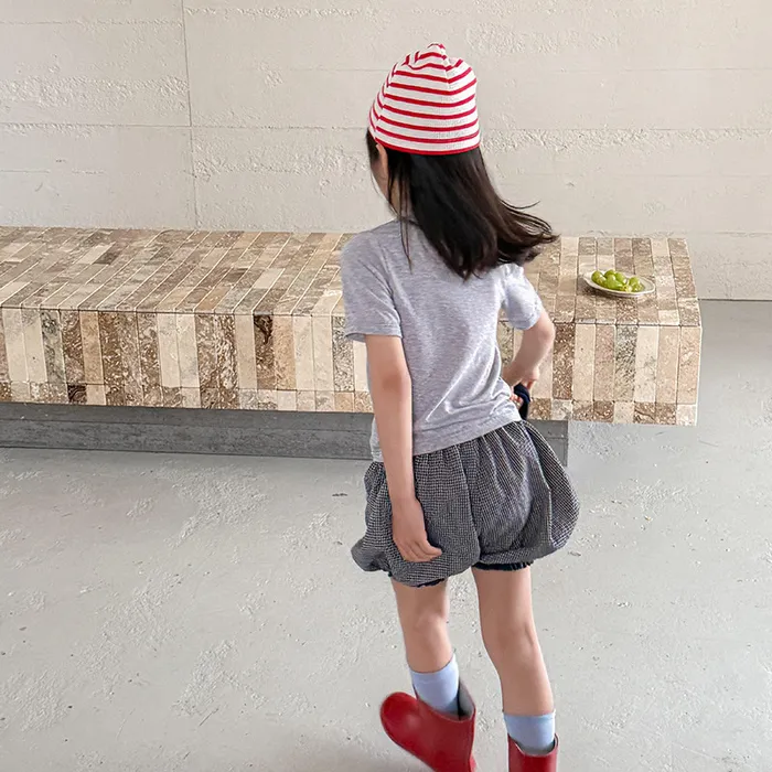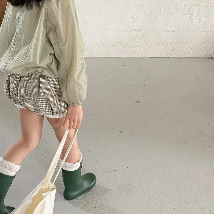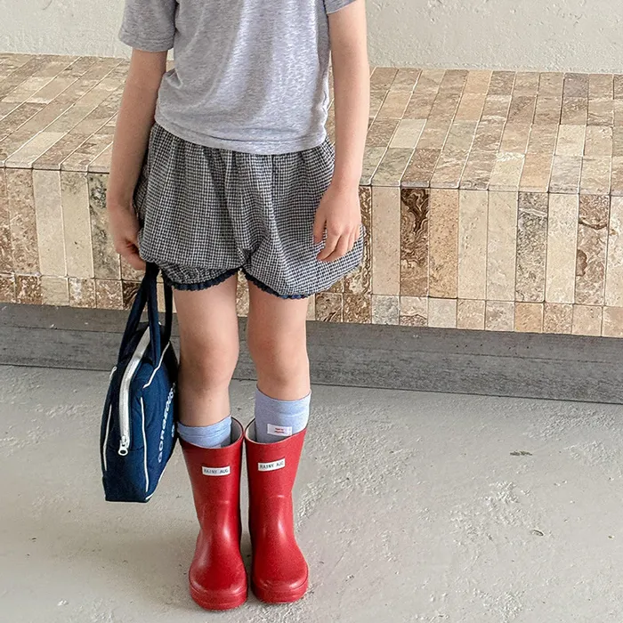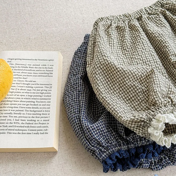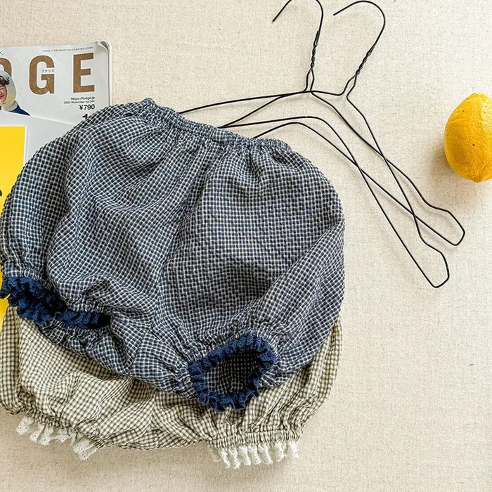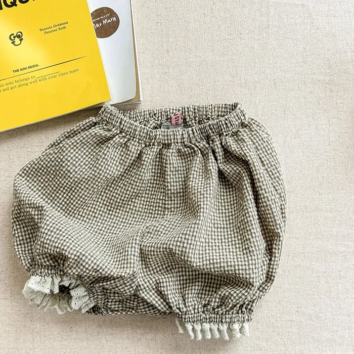 棉混紡細格紋蕾絲花邊花苞短褲